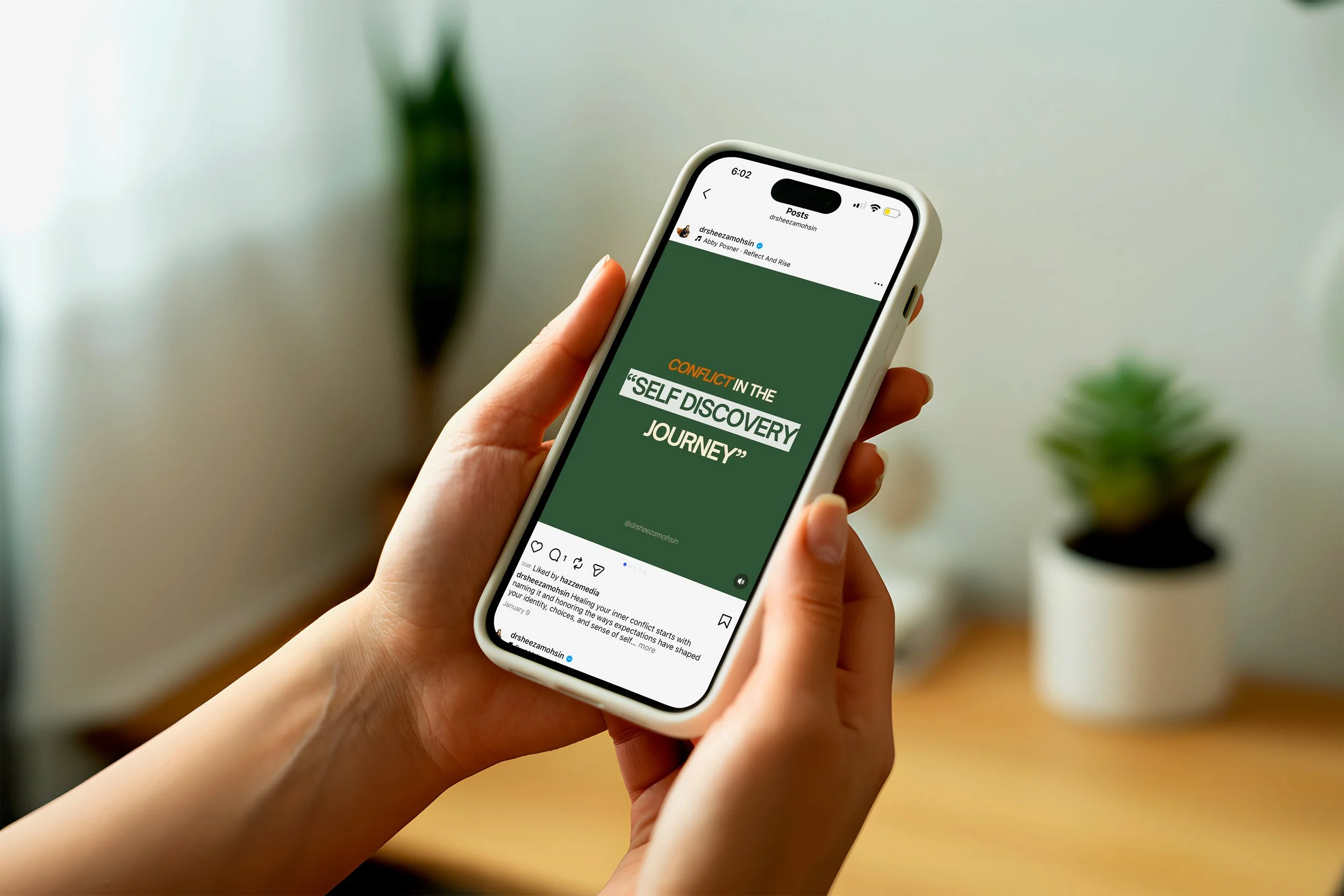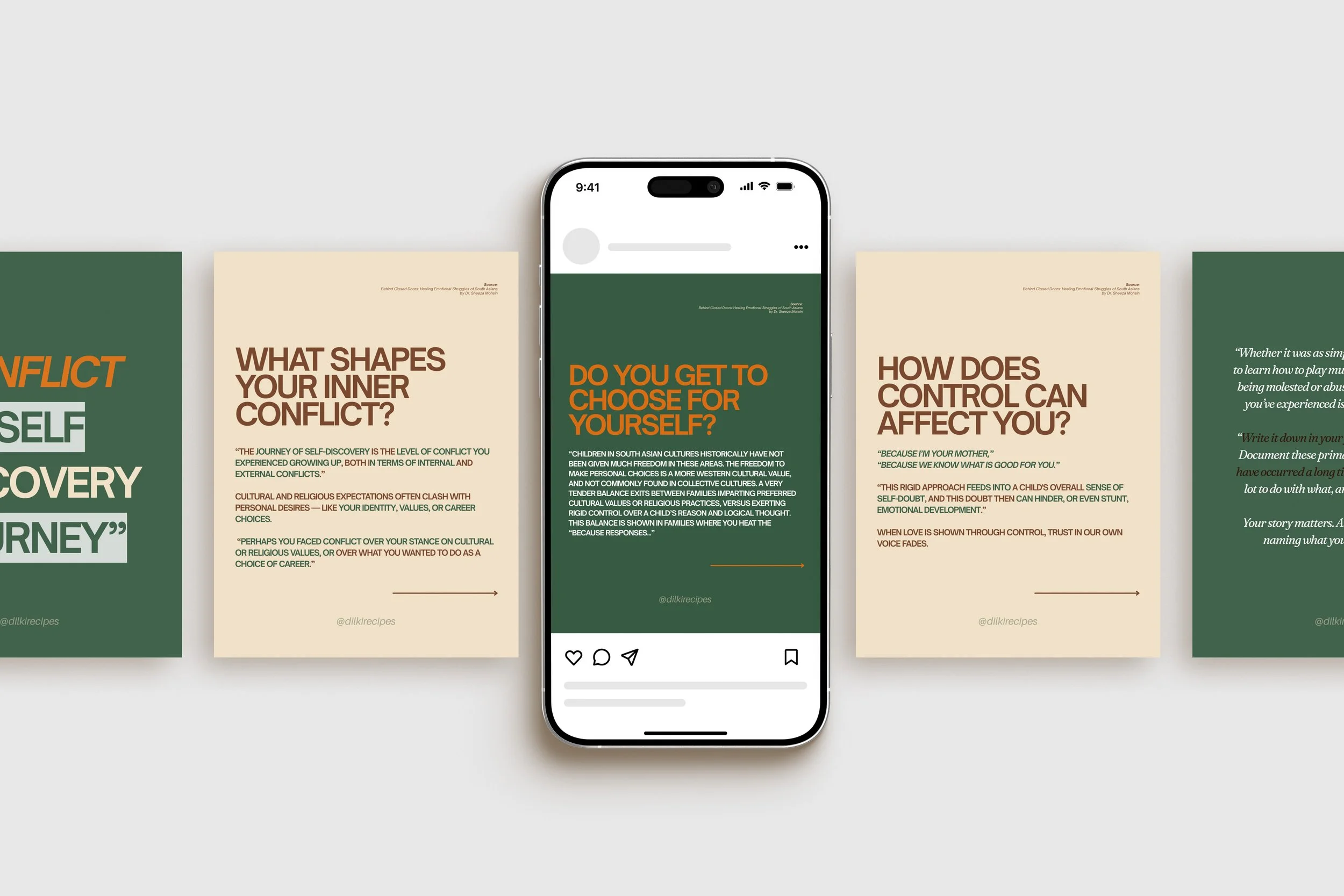 Dr. Sheeza Mohsin is a psychologist specializing in the emotional healing of South Asian communities. This carousel post was designed to bring content from her book — Behind Closed Doors: Healing Emotional Struggles of South Asians — to her Instagram audience in a visual way. The series walks through the role of conflict in self-discovery, using her existing color palette and typography to stay consistent with her brand. The bold layouts make heavy topics feel approachable and safe to engage with.