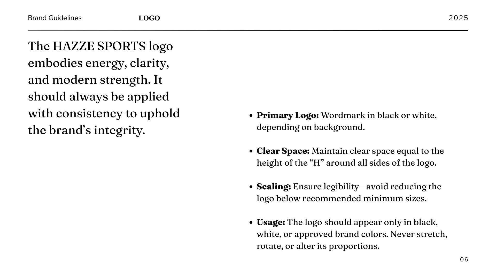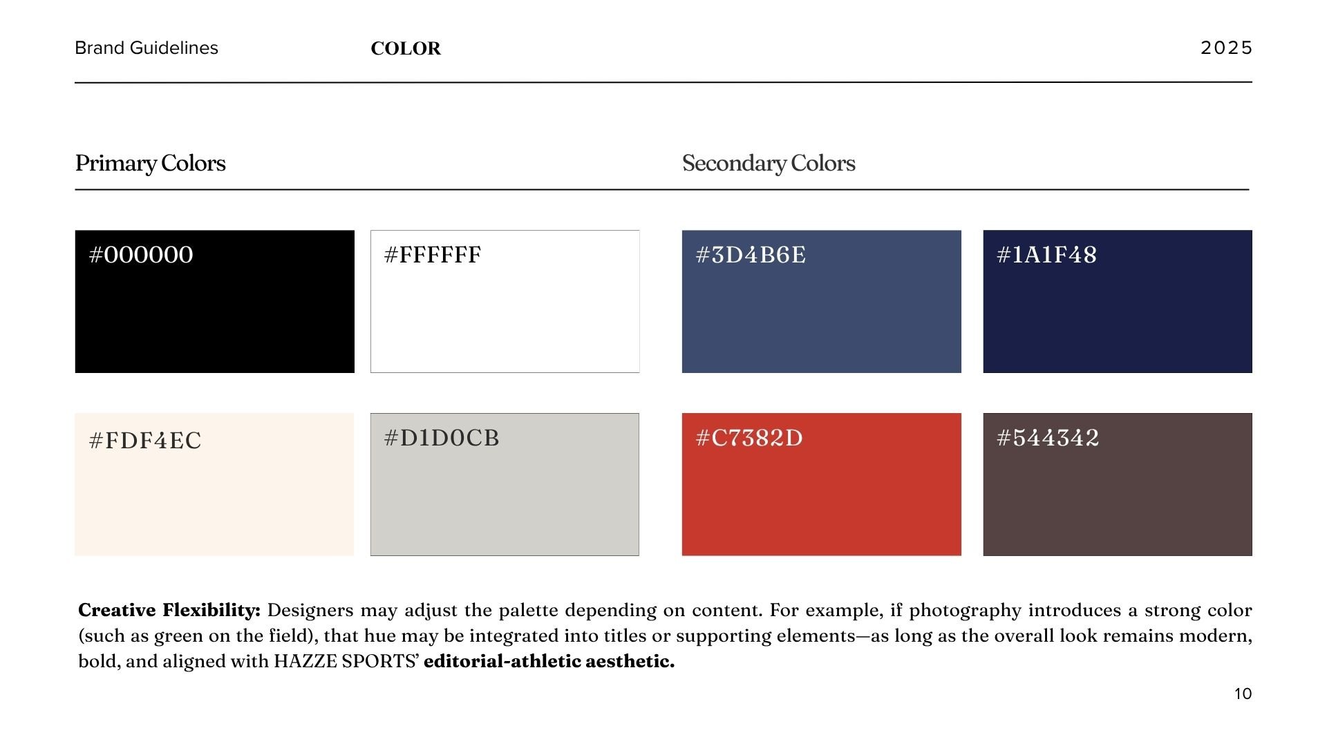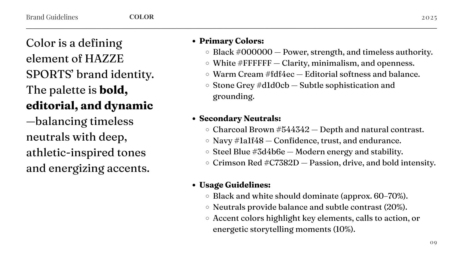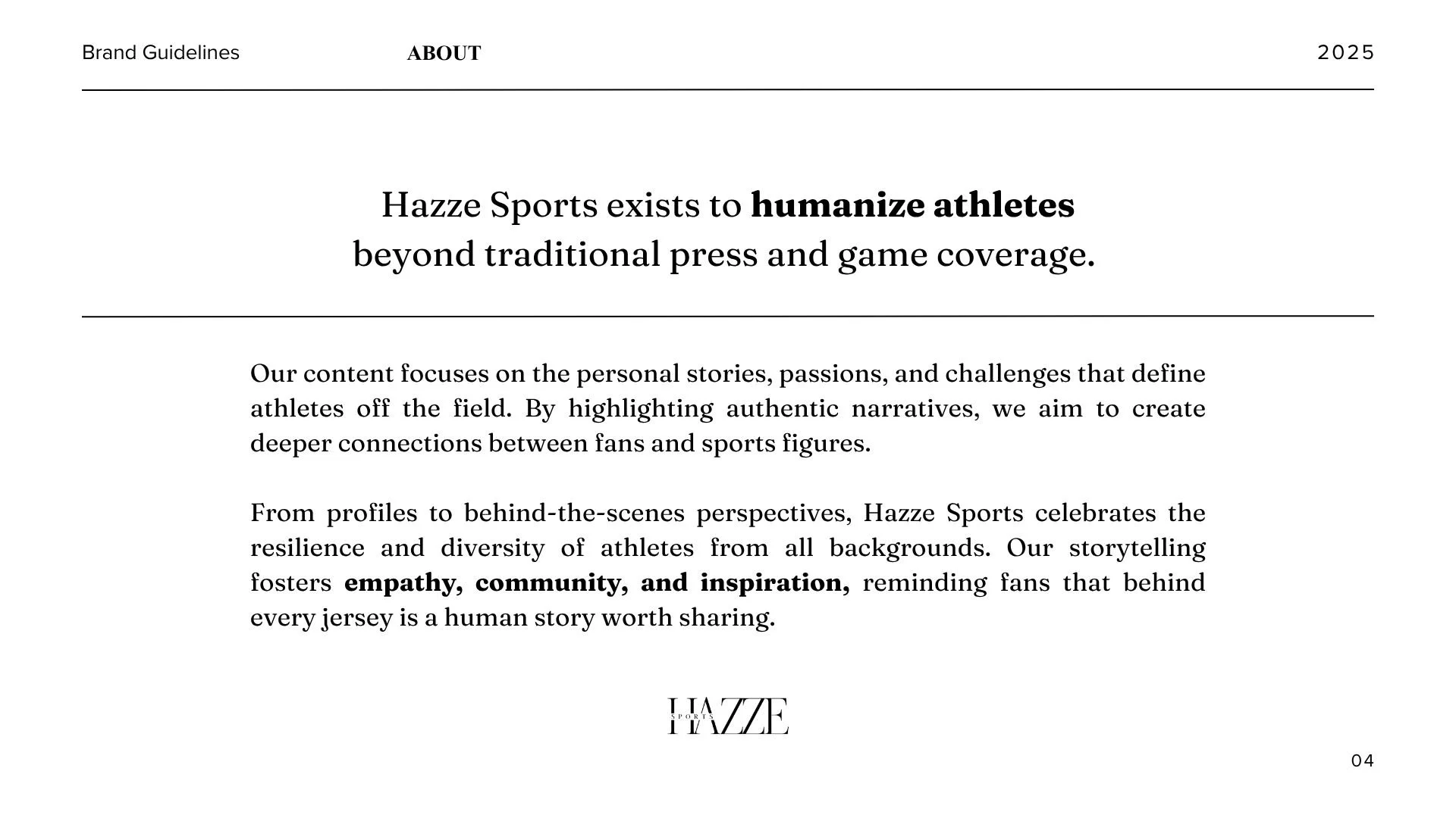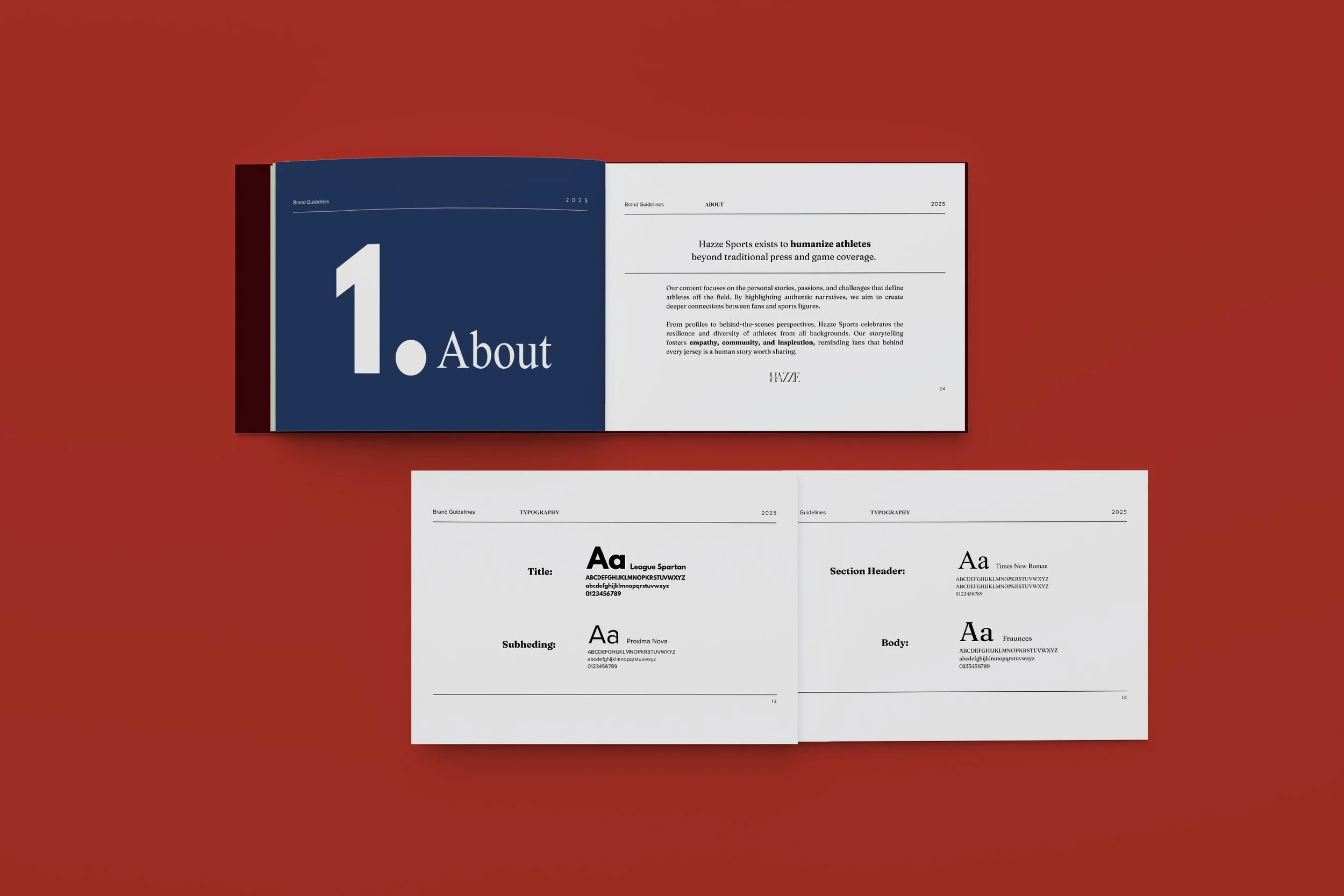 Hazze Sports is the sports platform of Hazze Media, focused on humanizing athletes beyond traditional press and game coverage. A separate set of brand guidelines was created to give the platform its own identity, bold, athletic, and editorial, while still feeling connected to the Hazze Media family. The palette shifts from the main brand's terracotta to navy and crimson red, bringing energy and confidence. The typography leads with League Spartan for titles, giving the layouts a strong, modern feel that matches the world of sports storytelling.