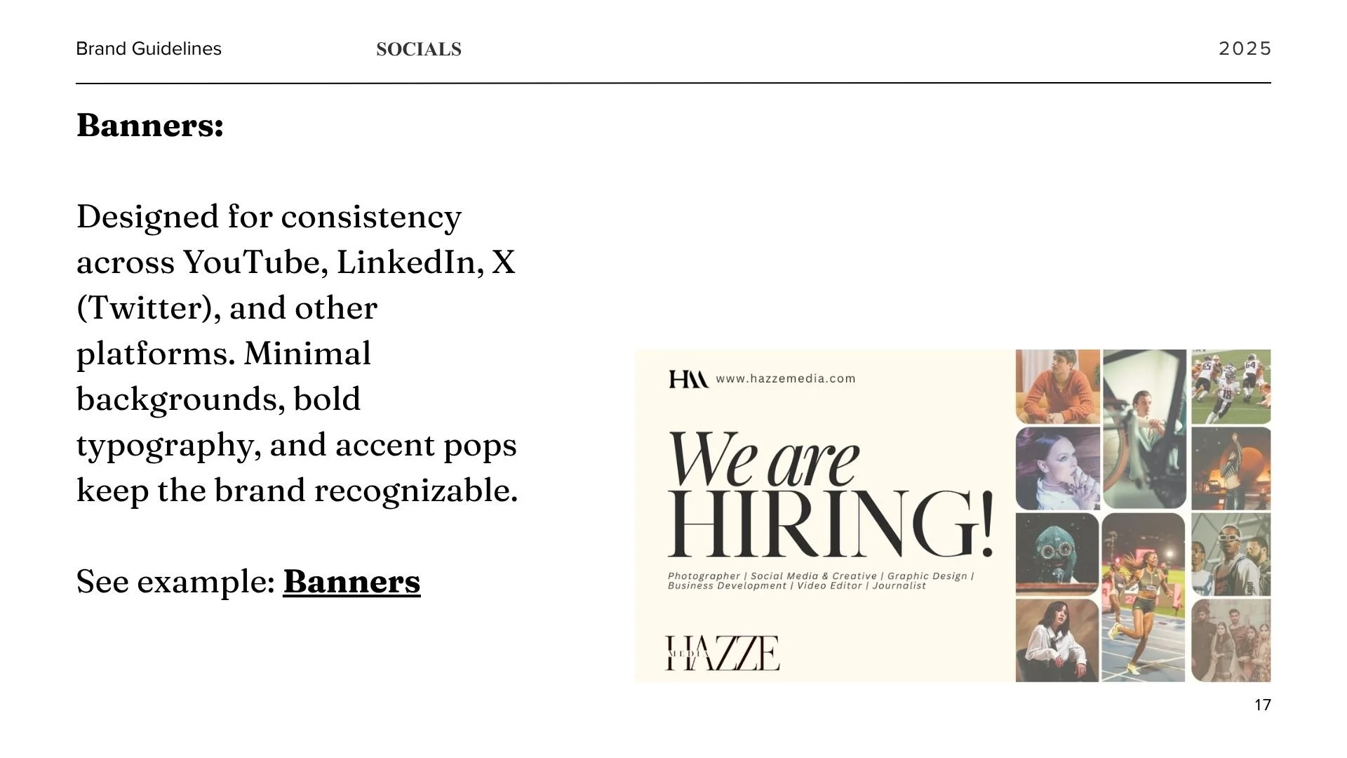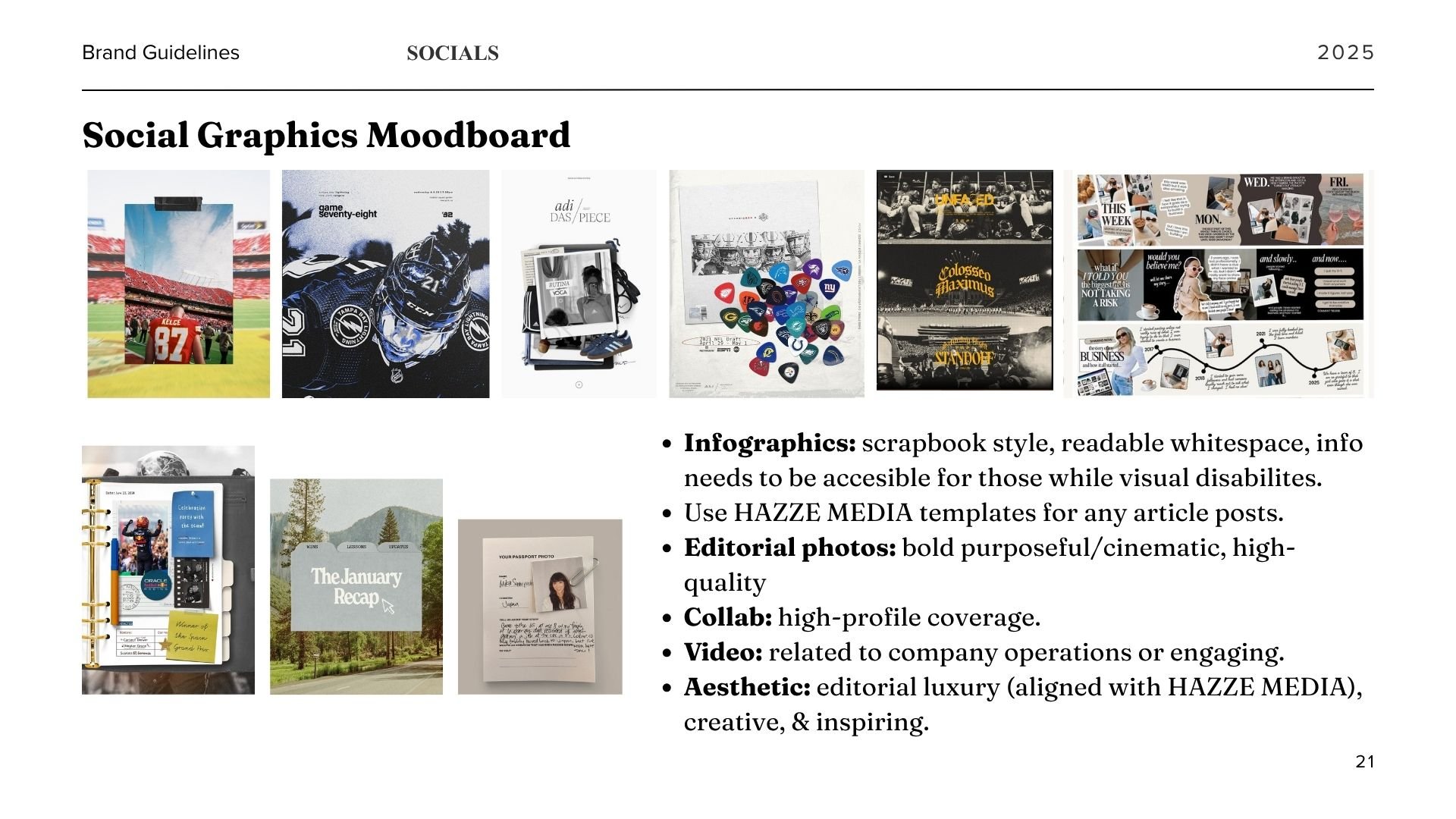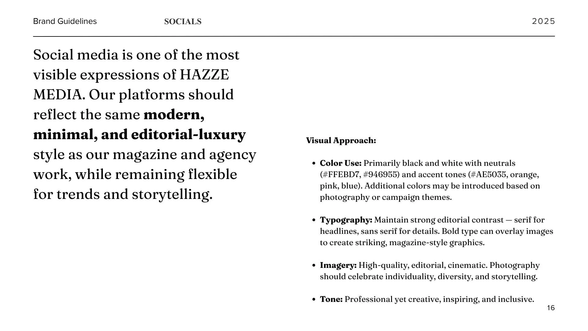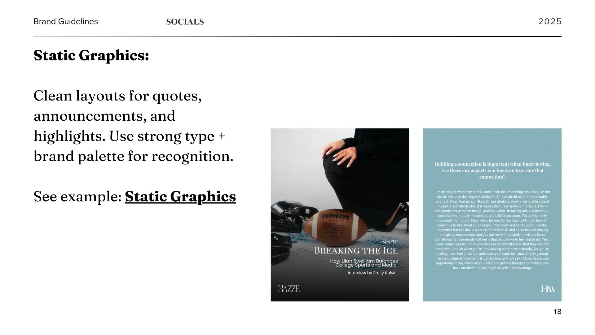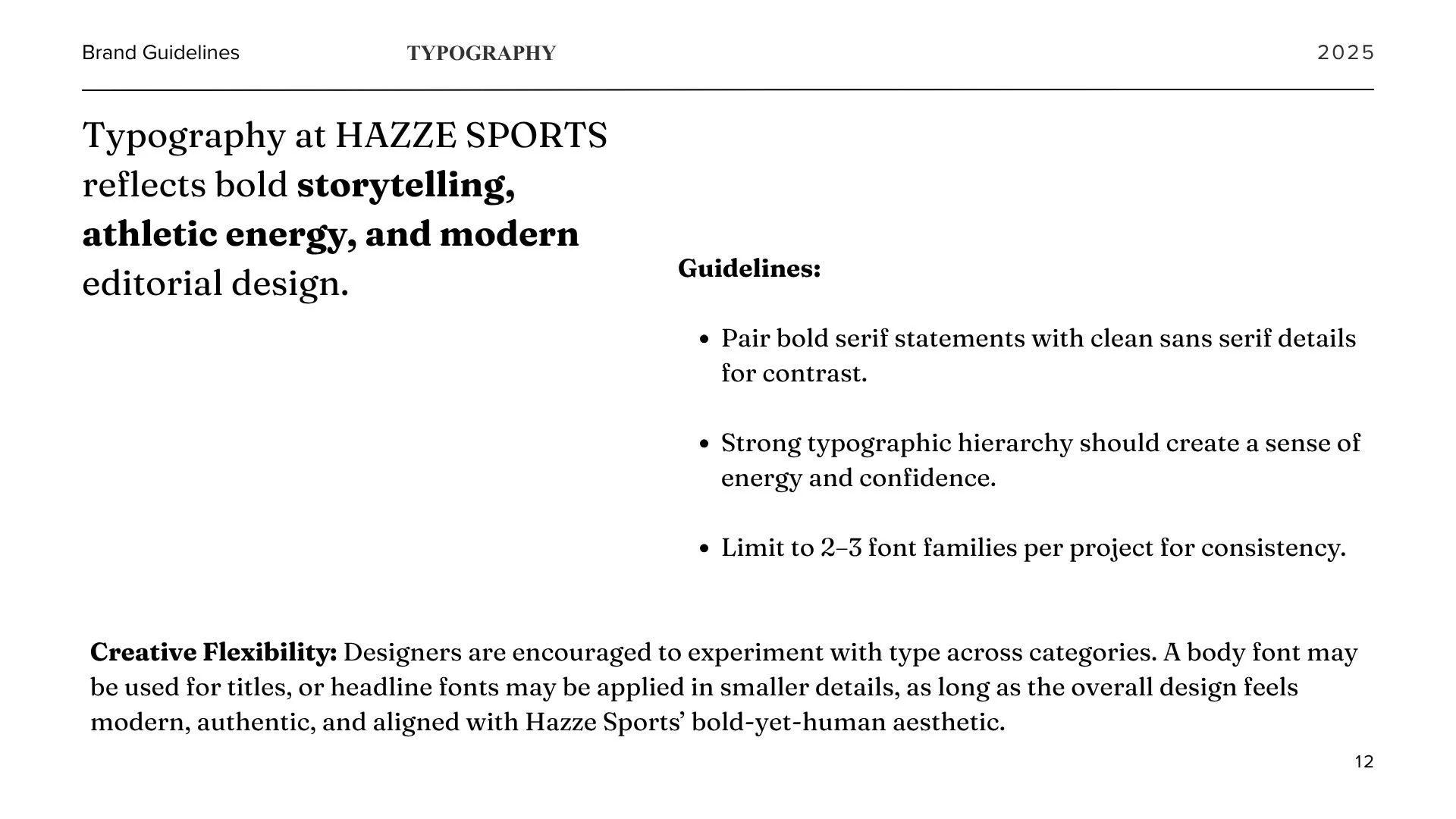 Hazze Sports is the sports platform of Hazze Media, focused on humanizing athletes beyond traditional press and game coverage. A separate set of brand guidelines was created to give the platform its own identity, bold, athletic, and editorial, while still feeling connected to the Hazze Media family. The palette shifts from the main brand's terracotta to navy and crimson red, bringing energy and confidence. The typography leads with League Spartan for titles, giving the layouts a strong, modern feel that matches the world of sports storytelling.