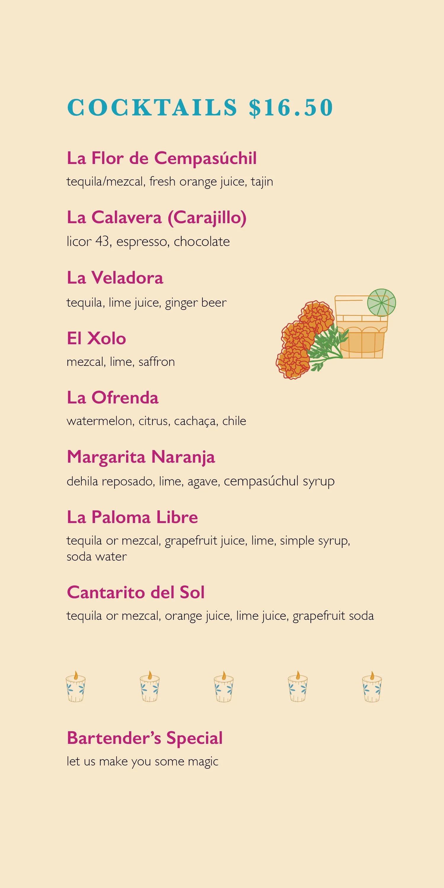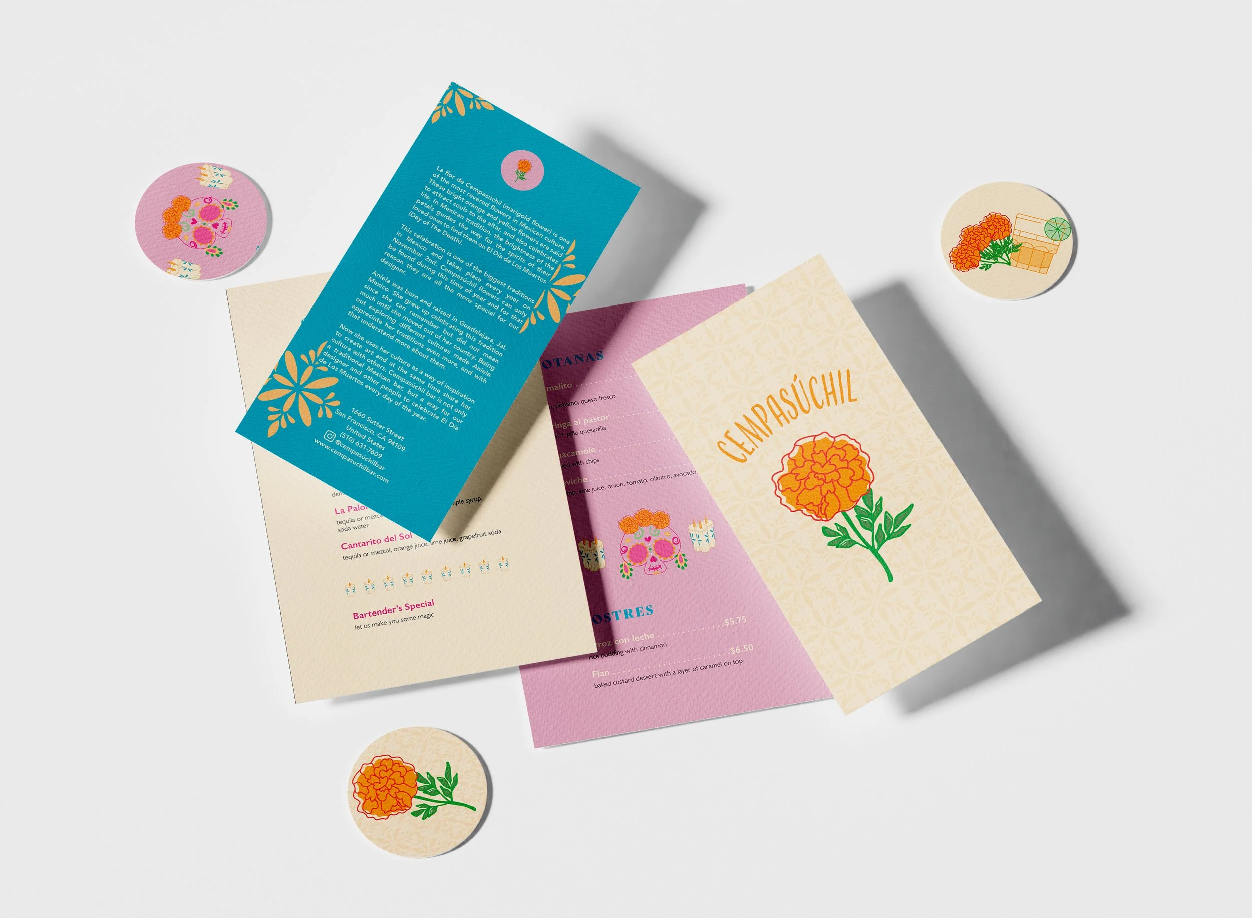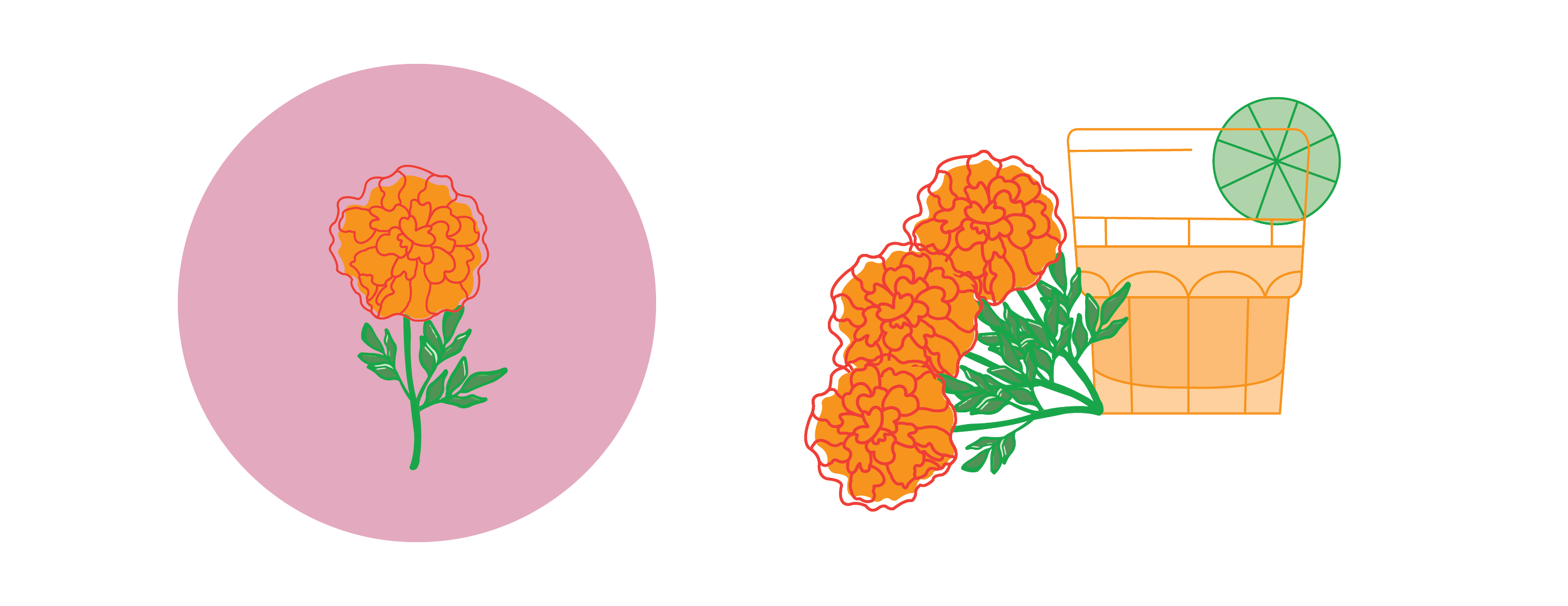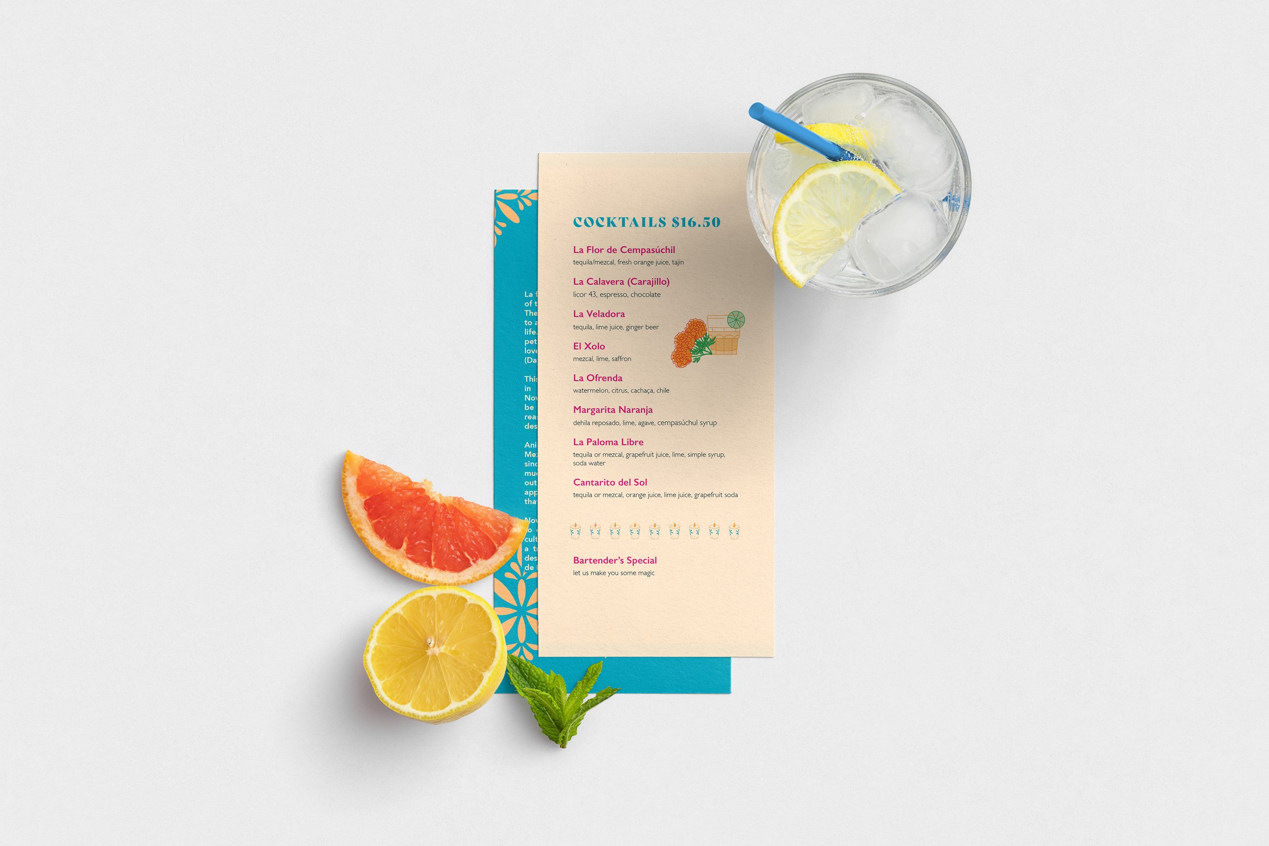 Cempasúchil is bar themed around the Mexican holiday Día de los Muertos. The goal was to elevate traditional symbols, such as the marigold and calaveras, into a sophisticated brand identity that avoids visual clichés while maintaining deep cultural roots.