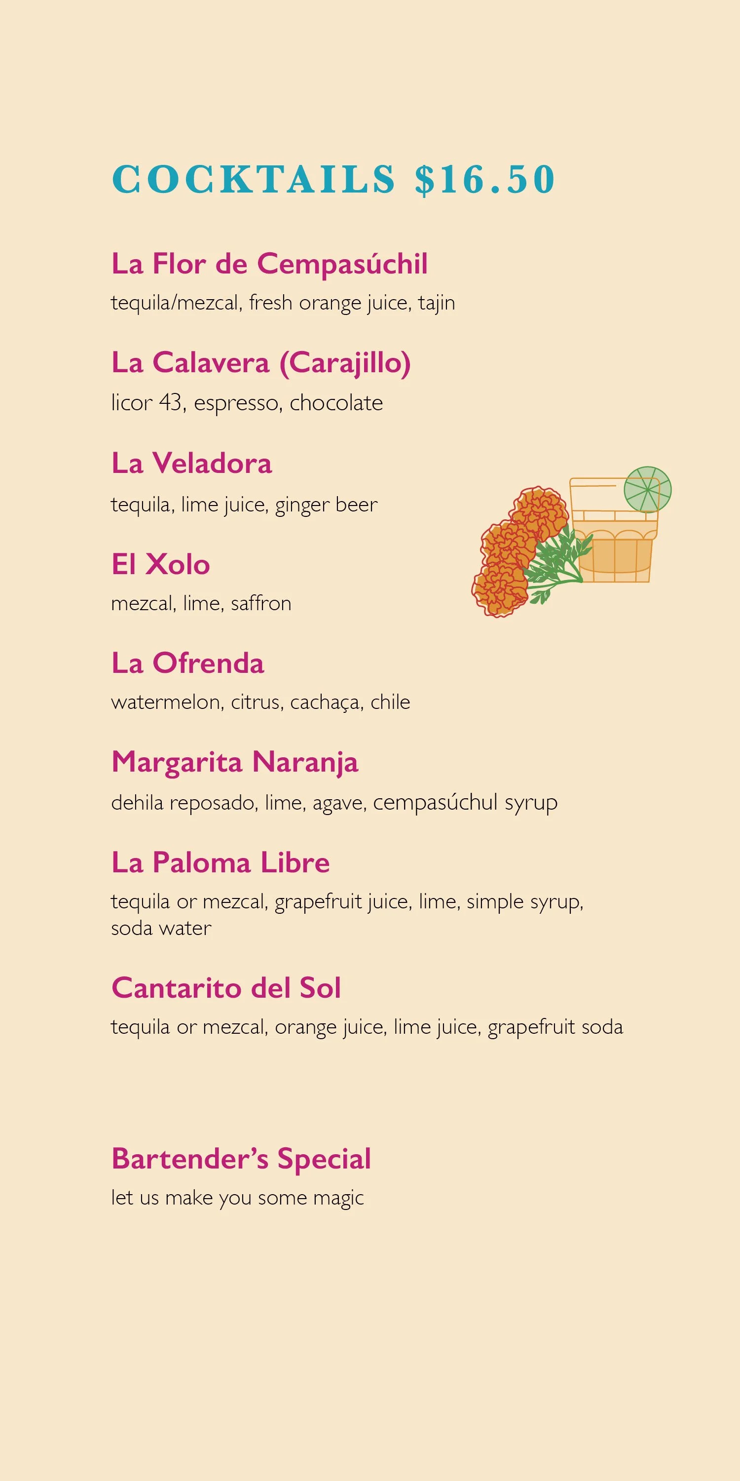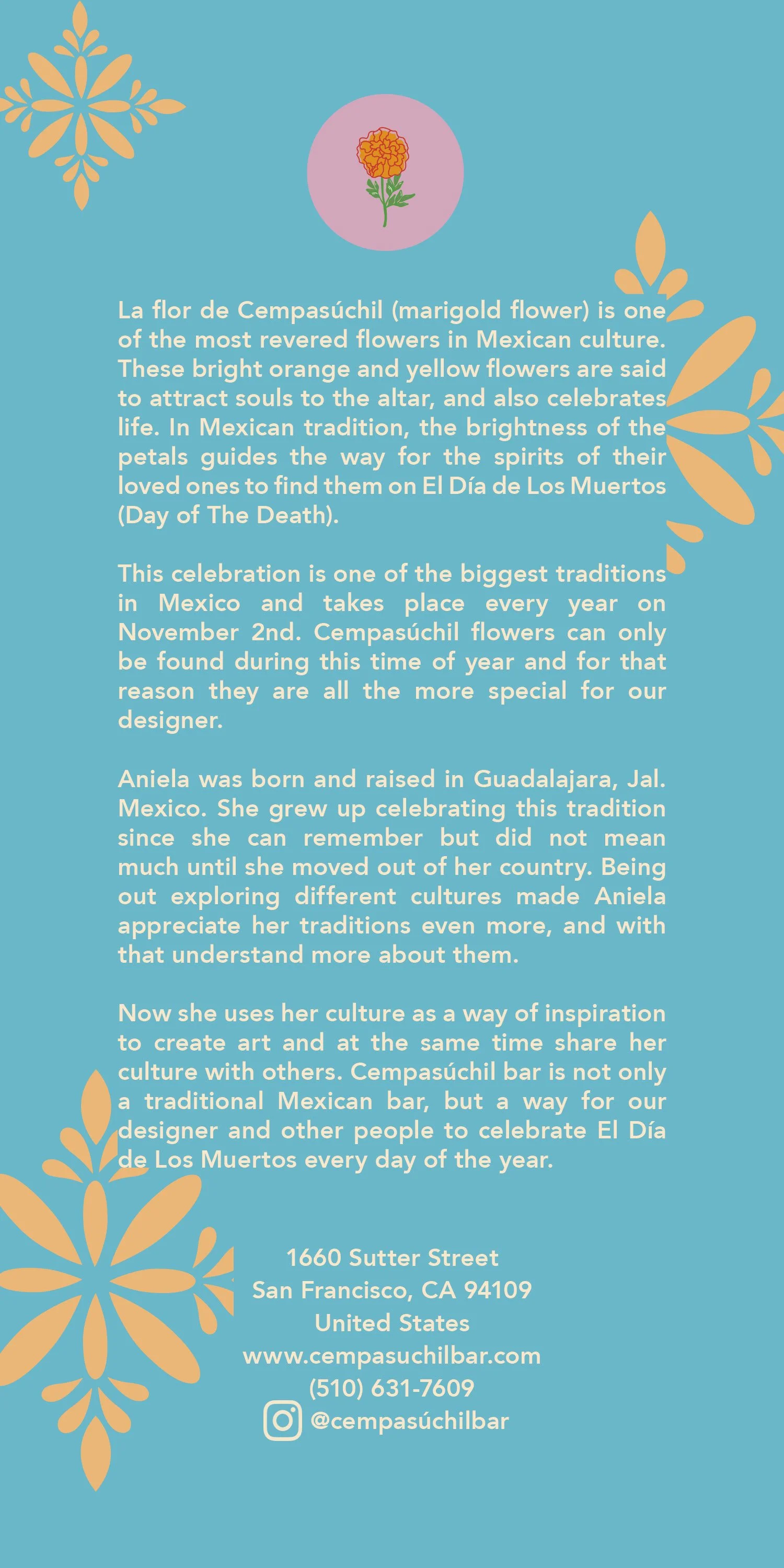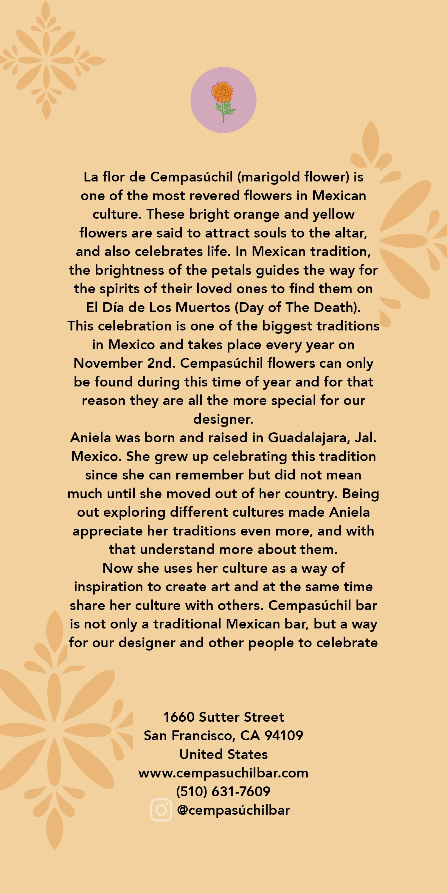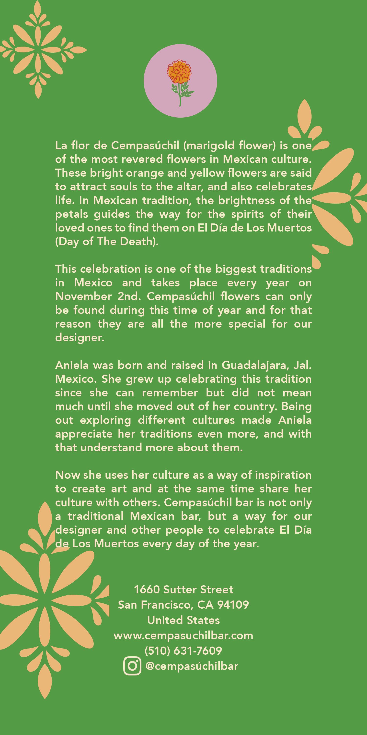Cempasúchil is bar themed around the Mexican holiday Día de los Muertos. The goal was to elevate traditional symbols, such as the marigold and calaveras, into a sophisticated brand identity that avoids visual clichés while maintaining deep cultural roots.